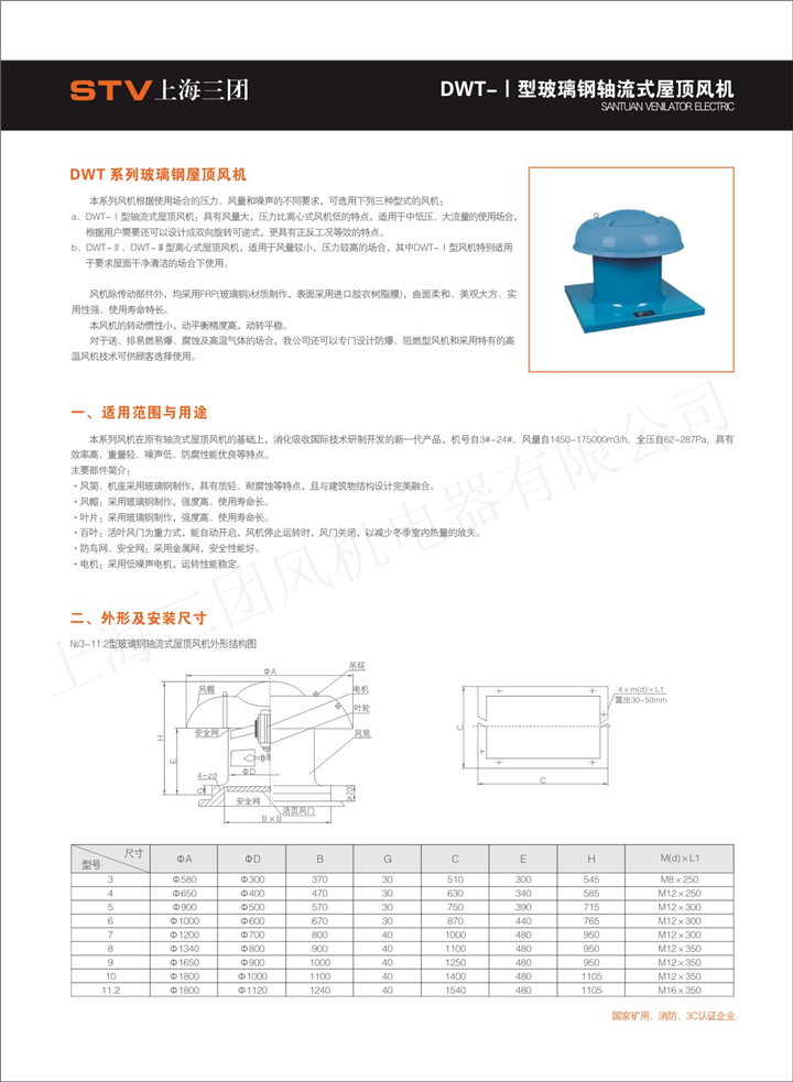 a、DWT-丨型轴流式屋顶风机:具有风量大,压力比离心式风机低的特点,适用于中低压、大流虽的使用场合, 根据用户需要还可以设计成双向旋转可逆式,更具有正反工况等效的特点。