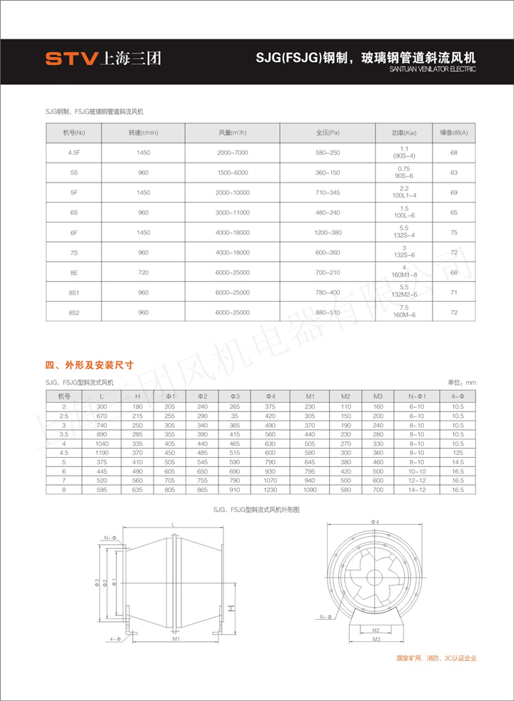 SJG、FSJG系列斜流式风按叶轮直径分为200-800mm十几种规格、十几个机号,风量由200~2500m3/h。 全压由50~1200Pa;具体工况数据请査看风机性能参数表