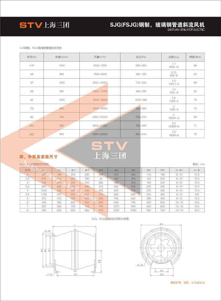 SJG、FSJG系列斜流式风按叶轮直径分为200-800mm十几种规格、十几个机号,风量由200~2500m3/h。 全压由50~1200Pa;具体工况数据请査看风机性能参数表